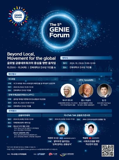 전북특별자치도는 10월 23일부터 24일까지 전북대학교 진수당 일원에서 '글로벌 금융 네트워크 중심을 향한 움직임'을 주제로 제5회 지니포럼(GENIE Forum)을 개최한다고 밝혔다.