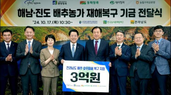 전라남도는 17일 한국농어촌희망재단으로부터 9월 배추 호우피해 농가 복구를 위한 상생기금 3억 원을 기탁받았다고 밝혔다.