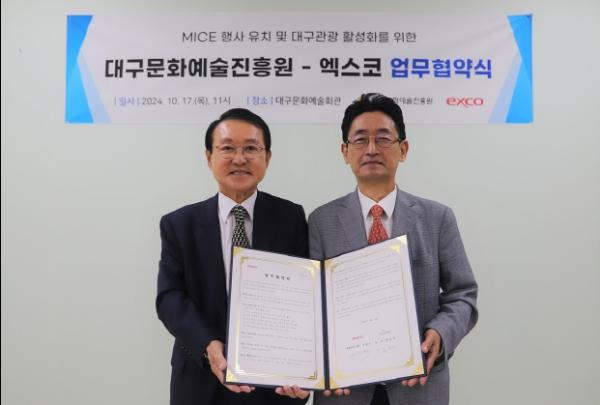 대구문화예술진흥원 관광본부는 ㈜엑스코와 MICE 행사(기업회의(Meeting)·포상관광(Incentive)·컨벤션(Convention)·전시(Exhibition)) 유치 및 대구 문화관광 활성화를 위한 업무협약(MOU)을 10월 17일 체결했다.