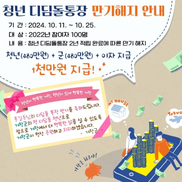 거창군은 2022년 ‘청년 디딤돌통장’ 사업 참여자 100명의 적금이 만기 되어 이번 달 25일까지 만기 적립금을 지급할 예정이라고 밝혔다.