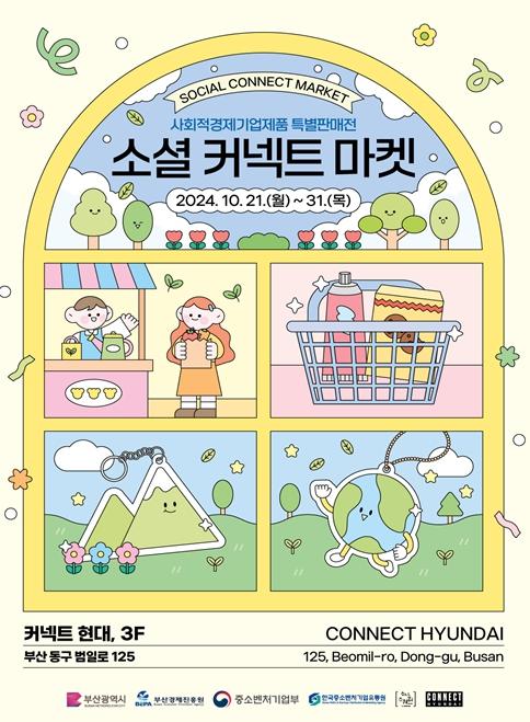 부산시는 오는 10월 21일부터 31일까지 범일동 커넥트현대 3층에서 부산 지역 사회적경제기업 제품 특별판매전 '소셜 커넥트 마켓'을 개최한다고 밝혔다.