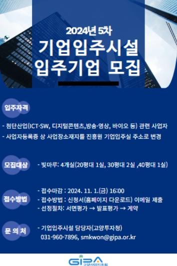 고양산업진흥원이 첨단산업 분야의 기업을 대상으로 오는 11월 1일까지 기업입주시설 신규 입주기업을 모집한다.