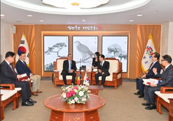 김태흠 지사는 18일 도청 접견실에서 체자르 마놀레 아르메아누 주한 루마니아 대사와 만나 상호 교류 및 협력 방안 등을 논의했다.