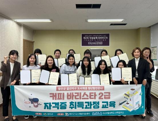 함안군 도시재생지원센터는 지난 17일 지(G)바리스타에서 수강생과 관계자 등 20여 명이 참석한 가운데 커피 바리스타 2급 자격증 취득과정 수료식을 진행했다.