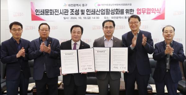 대전 동구는 18일 대전세종충남인쇄정보산업협동조합과 인쇄 문화전시관 조성과 인쇄산업 활성화를 위한 업무협약을 체결했다.