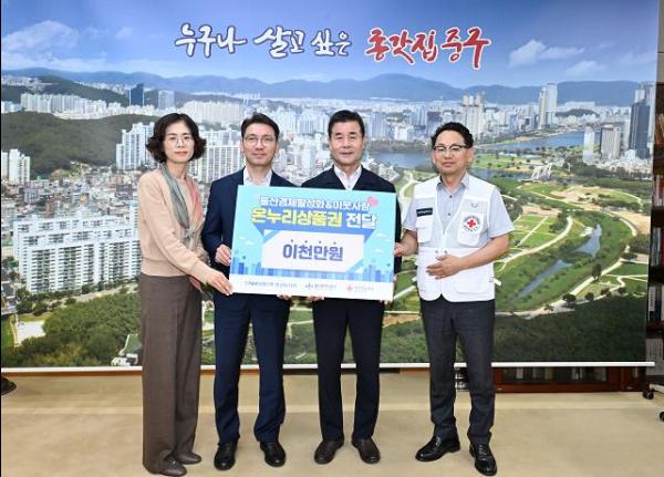 NH농협은행 옥교동지점이 10월 18일 오전 10시 중구청 구청장실을 찾아 대한적십자사 울산광역시지사를 통해 사랑의 온누리상품권 2,000만 원을 전달했다.