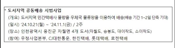 우정사업본부와의 협업으로 교통이 불편해 이동시간이 길고, 배송물량도 적어 택배 배송에 어려움을 겪는 도서지역에 대해, 우체국 도서지역 물류망을 이용해 민간 택배사 물량을 신속하게 배송할 수 있게 된다.