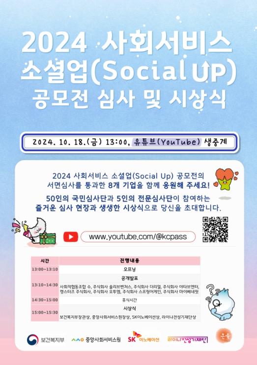2024 사회서비스 소셜업(Social Up) 공모전은 중앙사회서비스원에서 실시하는 민간 협업 사례 중 하나로, ‘국민 누구나 필요할 때 누리는 질 높은 사회서비스’를 실현하기 위한 발걸음이다.