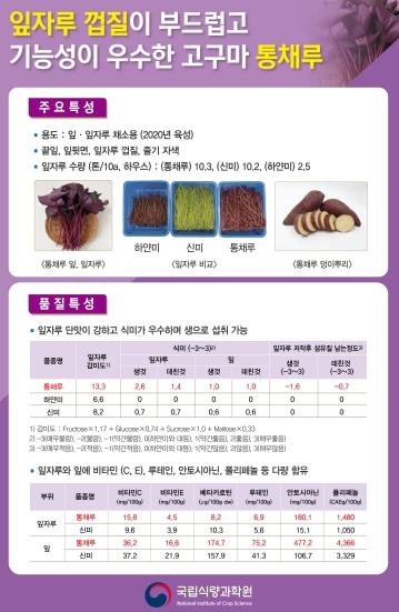 800㎏을 분양하는 통채루는 잎채소용 고구마로 잎자루의 단맛이 강하고 식미가 우수하며 껍질을 벗기지 않고도 생으로 섭취가 가능하다.