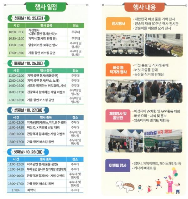 이번 축제는 10월 25일 개막식을 시작으로 양송이재배 60주년 행사, 대한민국 버섯 품목 기획전시, 버섯을 이용한 요리 전시 등을 준비했다.