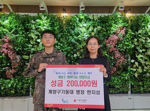 이번 달 전역을 앞둔 상근예비역 한지성 병장이 지난 10월 17일 형편이 어려운 청년을 위해 써 달라며 군 복무기간 중 모은 20만 원의 성금을 계양구에 기탁했다.