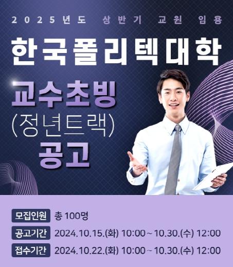 한국폴리텍대학(이사장 이철수, 이하 ‘폴리텍대학’)이 대규모 교수 초빙에 나선다. 폴리텍대학은 ‘2025년도 상반기 임용 교수 초빙’을 통해 16개 계열에서 교원 100명을 채용한다고 20일 밝혔다. 원서접수는 오는 22일부터 30일 정오(12시)까지다.