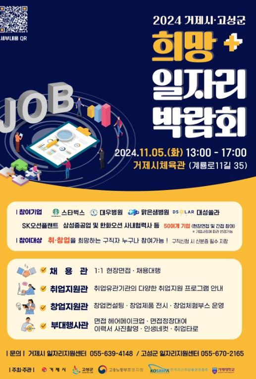 거제시는 지역기업과 구직자들의 맞춤형 일자리 매칭을 위해 11월 5일 오후 1시부터 5시까지 거제시 체육관에서 ‘2024 희망 일자리 박람회’를 개최한다.