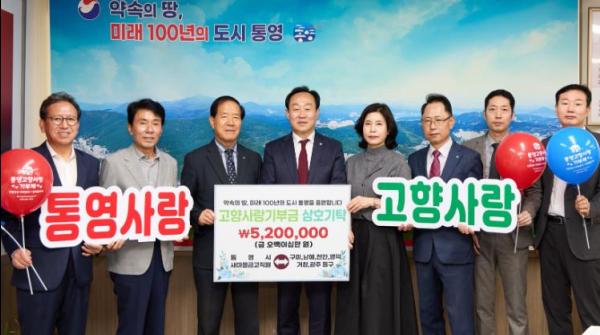 통영시는 지난 22일 통영시 관내 새마을금고 임직원 52명이 거창, 구미, 광주 동구, 남해, 영덕, 천안에 고향사랑기부금 520만 원을 상호 기부했다고 밝혔다.