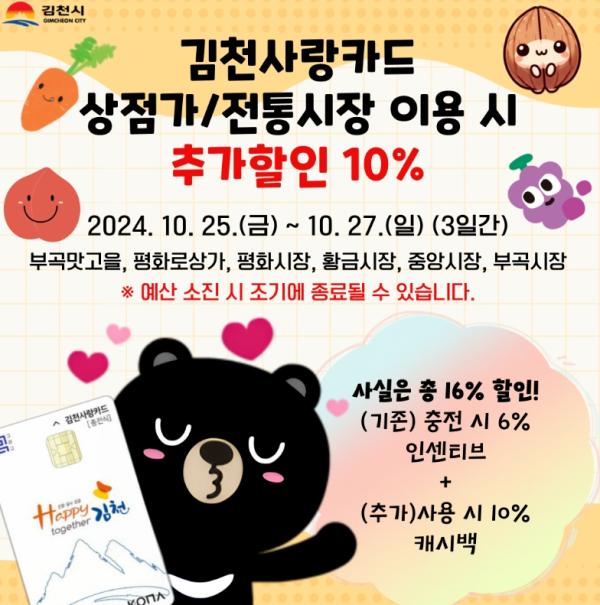 김천시는 침체된 상권 소비 촉진과 전통시장 이용 증대로 지역경제 활성화를 위해 오는 10월 25일부터 10월 27일까지 3일간 상점가?전통시장에서 김천사랑카드 이용시 추가할인 10%를 해주는 특별 이벤트를 진행한다고 밝혔다.