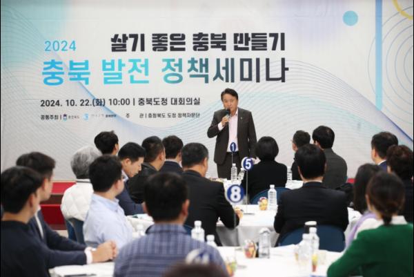 충청북도와 한국은행 충북본부가 공동 주최하고 충청북도 도정 정책자문단이 주관하는 〈2024 충북 발전 정책세미나〉가 10월 22일 충북도청 대회의실에서 정책자문단, 민간 전문가, 도민 등 100여명이 참석한 가운데 열렸다,