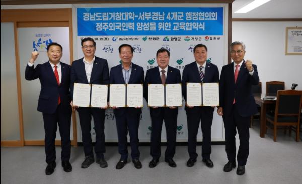 경남도립거창대학은 지난 19일 산청군청에서 서부경남 4개군(산청, 함양, 거창, 합천) 행정협의회와 신성범 국회의원이 참석한 가운데 외국인력의 정주와 지역 상생을 위한 업무협약을 체결했다고 밝혔다.