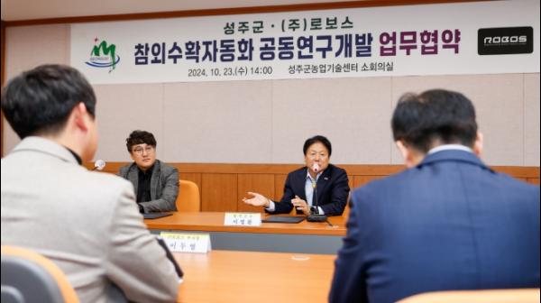 성주군은 10. 23일 농업기술센터에서 주식회사 로보스와 참외수확자동화로봇 개발을 위한 공동연구개발 업무협약(MOU)을 체결했다고 밝혔다.
