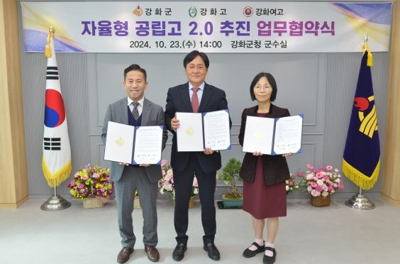 강화군은 23일 공교육 활성화와 지역교육 여건 개선을 위해 강화고등학교, 강화여자고등학교와 ‘자율형 공립고등학교 2.0 운영 업무협약’을 체결했다고 밝혔다.