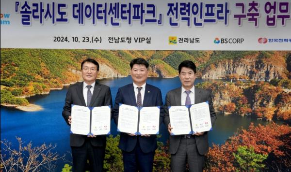 전라남도는 23일 도청에서 한국전력공사, BS산업과 솔라시도(구성지구) 데이터센터파크에 전력인프라(154kV 변전소 및 송전선로) 조기 구축을 위한 업무협약을 했다.