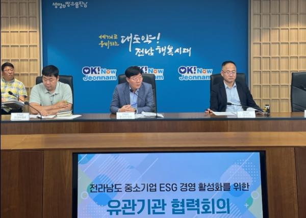 전라남도는 전남탄소중립지원센터, 전남중소기업일자리경제진흥원과 공동으로 23일 전남동부지역본부에서 중소기업 환경·사회·투명경영(ESG) 활성화 협력회의를 열어 협력 방안을 논의했다.