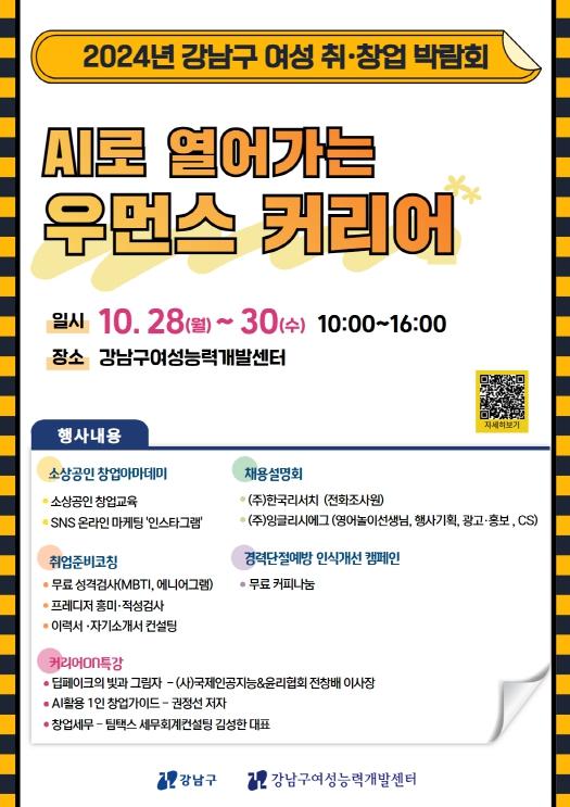꿈이 모이는 도시, 미래를 그리는 강남구가 오는 10월 28일부터 30일까지 강남구여성능력개발센터에서 제14회 강남구 여성 취·창업 박람회 ‘AI로 열어가는 우먼스 커리어’를 개최한다.