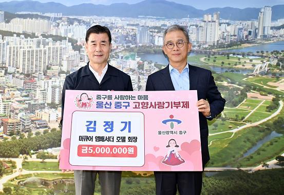 김정기 머큐어앰배서더 울산 호텔 회장이 10월 24일 고향사랑e음 누리집을 통해서 울산 중구에 고향사랑기부금 500만 원을 기탁했다.