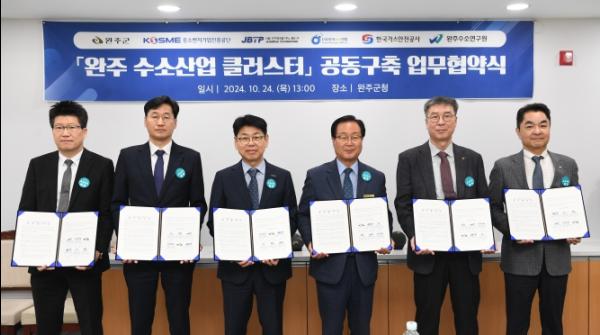 수소 산업을 선도하고 있는 완주군이 수소 기업 지원책 마련을 위해 중소벤처기업진흥공단, 한국수소연합, 한국가스안전공사, 전북테크노파크, 완주수소연구원과 ‘완주 수소산업 클러스터’ 공동 구축을 위한 업무협약을 체결했다.