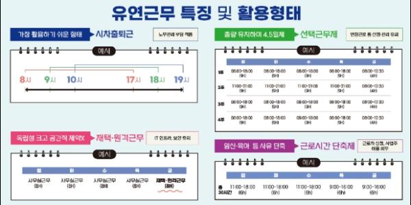 매뉴얼에는 시차출퇴근, 선택근무제, 재택·원격근무, 근로시간 단축제의 4가지 제도를 소개하며, 유연근무 도입 기초단계의 설문조사 예시부터, 선택 가능한 실제 모델, 취업규칙 개정 등 요건, 초과근무 등 관리의 유의점과 같이 실무상 유용하게 활용될 수 있는 방법들을 세세하게 소개하고 있다.
