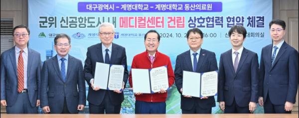 대구광역시는 10월 24일 오후 4시 대구광역시 산격청사에서 계명대학교, 계명대학교 동산의료원과 군위 신공항도시 내 ‘메디컬센터 건립을 위한 상호협력 협약(MOU)’을 체결했다.
