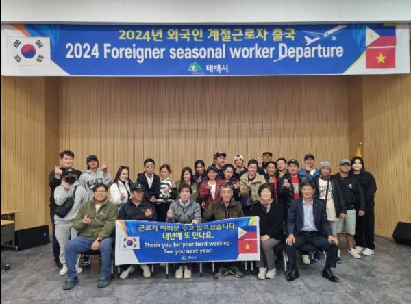 태백시는 지난 10월 24일 농번기 일손이 부족한 농가에 큰 도움을 주고 고국으로 돌아가는 외국인 계절근로자를 위한 환송행사를 가지고, 그간 노력을 아끼지 않았던 외국인 계절근로자와 석별의 정을 나누었다고 밝혔다.