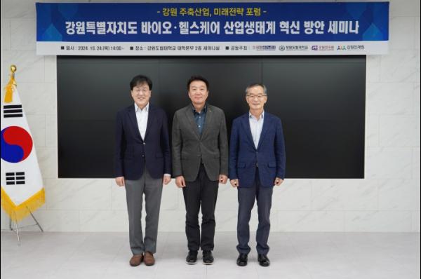 강원도립대학교(총장 김광래)는 10월 24일(목) 강원도립대학교에서 강원 바이오·헬스케어 산업생태계 혁신 방안을 논의하기 위해 (재)강원테크노파크, 강원연구원, 강원인재원과 공동으로 세미나를 개최했다.