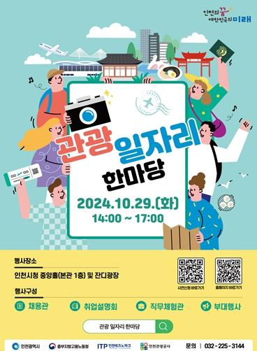 인천광역시는 10월 29일 인천시청 중앙홀(본관 1층)과 인천애뜰(잔디광장)에서 ‘관광 일자리 한마당'이 개최된다고 밝혔다.