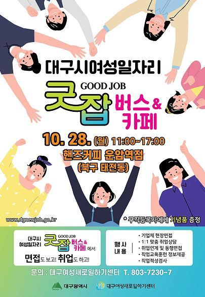 대구광역시는 취업을 희망하는 경력단절 및 미취업 여성을 위해 ‘찾아가는 취업상담 서비스 ‘굿잡(Good Job)카페’’를 오는 10월 28일 오전 11시부터 오후 5시까지 북구에 위치한 핸즈커피 운암역점(칠곡운암역 1번출구 인근)에서 운영한다.