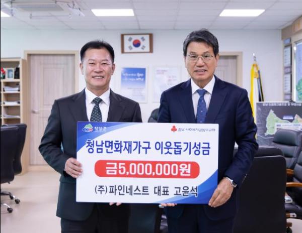 청양군은 지난 24일 ㈜파인네스트 고윤석 대표가 군을 방문해 청남면 화재 주민에게 전달해 달라며 5백만원을 기탁했다고 전했다.