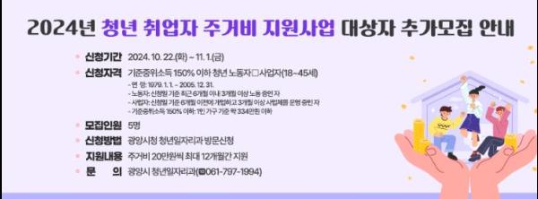 광양시는 11월 1일까지 2024년 청년 취업자 주거비 지원사업 대상자를 추가로 모집한다고 밝혔다.