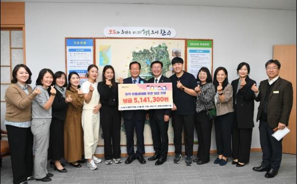 완주 삼봉지구 국공립 어린이집(나래푸르지오 원장 김진화, 미래나무 원장 이동영, 삼봉 원장 조애경, 우미키즈 원장 이은미, 중흥바른 원장 백성미)이 바자회를 개최하고 이웃돕기 성금 500여만 원을 완주군에 전달했다.