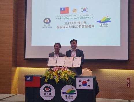 예산군은 10월 25일 대만 타이둥현 지상향에 위치한 파파고리조트에서 우호교류 협약식을 진행했다. 이번 협약식을 위해 예산군수, 기획실장 등 군관계자들이 대만에 직접 방문했고, 대만 외교부 집행장, 슬로시티 총회장 등 관련된 많은 이들이 방문단 환영과 우호교류 협약을 축하하기 위해 참석했다.