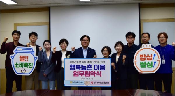 광주광역시농업기술센터는 농협 광주본부와 25일 농업기술센터 회의실에서 농촌경제 발전과 공익사업 공동 추진을 위한 ‘행복농촌 이음 업무협약식’을 개최했다.