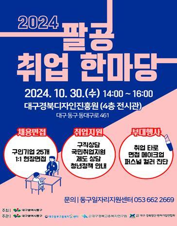대구 동구청은 오는 30일, 대구경북디자인진흥원 4층 전시관에서 동구 청년 및 중년층 취업지원을 위한 ‘2024년 팔공취업한마당’ 행사를 개최한다.