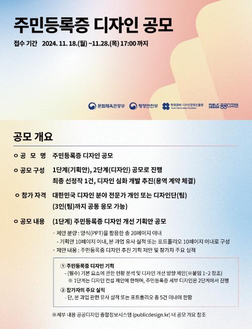 주민등록증 디자인 공모는 디자인 전문가가 참여하는 ‘주민등록증 디자인 공모’와 일반 국민의 의견을 받는 ‘국민 아이디어 공모’로 나누어 개최하며, 접수 기간은 11월 18일부터 11월 28일까지다.