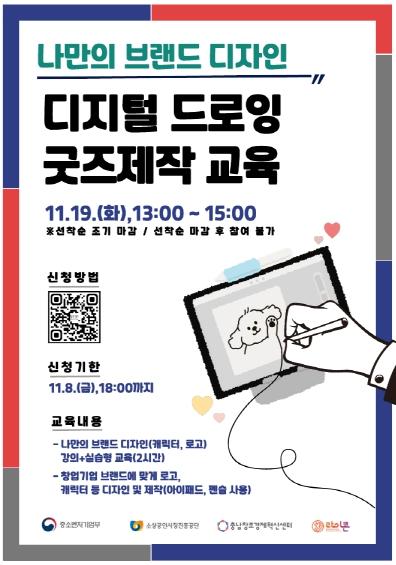 교육은 나만의 브랜드 디자인 제작이라는 주제로 강의 실습형 2시간 교육으로 이루어져 있으며, 본인의 브랜드에 맞게 로고, 캐릭터 등 아이패드와 펜슬을 사용하여 디자인 및 시제품을 개발할 수 있다.