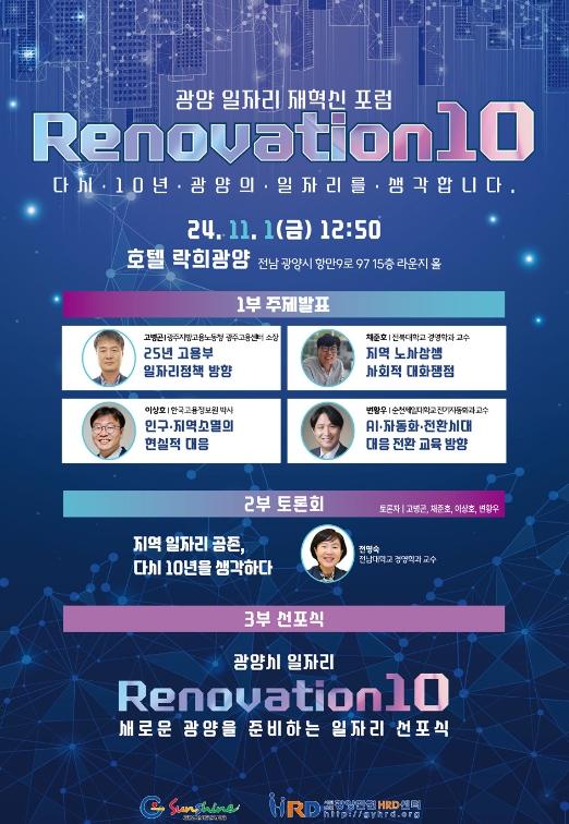 광양시는 11월 1일 오후 1시 광양락희호텔 15층 라운지홀에서 일자리 재혁신 포럼 ‘Renovation 10’이 개최된다고 밝혔다.