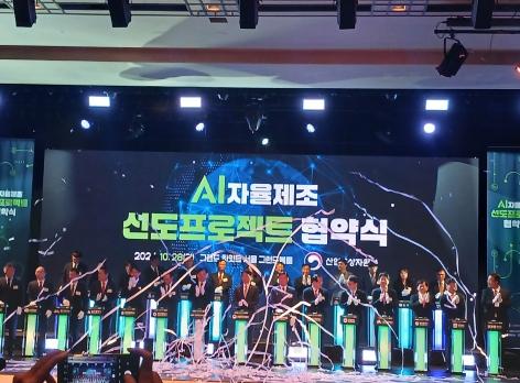 제조기업에 인공지능(AI)기술을 도입하는 AI 자율제조 선도프로젝트 협약식이 10. 28. 오후 3시 서울 그랜드 하얏트 호텔에서 산업통상자원부와 15개 광역시도, 10개 시군이 참여한 가운데 개최됐다.