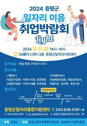 충북 증평군이 지역 일자리 창출 및 구인ㆍ구직자 간 미스매칭 해소를 위해 오는 31일 34플러스센터에서 ‘2024 일자리 이음 취업박람회 LIGHT’를 개최한다.