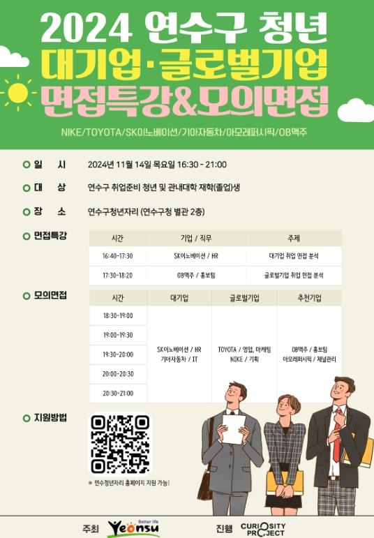 이재호 연수구청장은 “이번 특강과 모의 면접이 연수구 청년들의 취업 성공에 실질적인 도움이 되길 기대하며, 앞으로도 청년들이 자신감 있게 도전할 수 있도록 다양한 실전형 취업 지원 프로그램을 지속 발굴할 것”이라고 밝혔다.