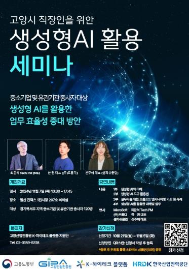 고양산업진흥원 K-하이테크 플랫폼 지원단이 오는 11월 7일 킨텍스 제1전시장 207호에서 ‘생성형 인공지능(AI) 활용 방안 세미나’를 개최한다.