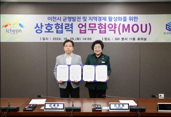 경기도 이천시는 경기주택도시공사와 29일 경기주택도시공사 본사에서 ‘이천시 균형 발전 및 지역 경제 활성화를 위한 상호협력 업무협약’을 체결했다.