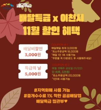 이천시는 배달요금 인상에 따른 소상공인과 시민 부담을 덜기 위해 공공배달앱 ‘배달특급’ 소비자 대상 11월 프로모션을 추진한다고 밝혔다.