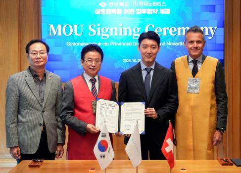 이철우 경북도지사는 28일 스위스 바젤에 위치한 노바티스(Novartis)를 방문해 패트릭 호버(Horber, Patrick) 인터내셔널 혁신의약품 사장과 면담하고, 상호협력을 위한 업무협약(MOU)을 체결했다. 협약식에는 이철우 도지사, 패트릭 호버 사장, 유병재 한국노바티스 대표이사가 참석한 가운데 이루어졌다.